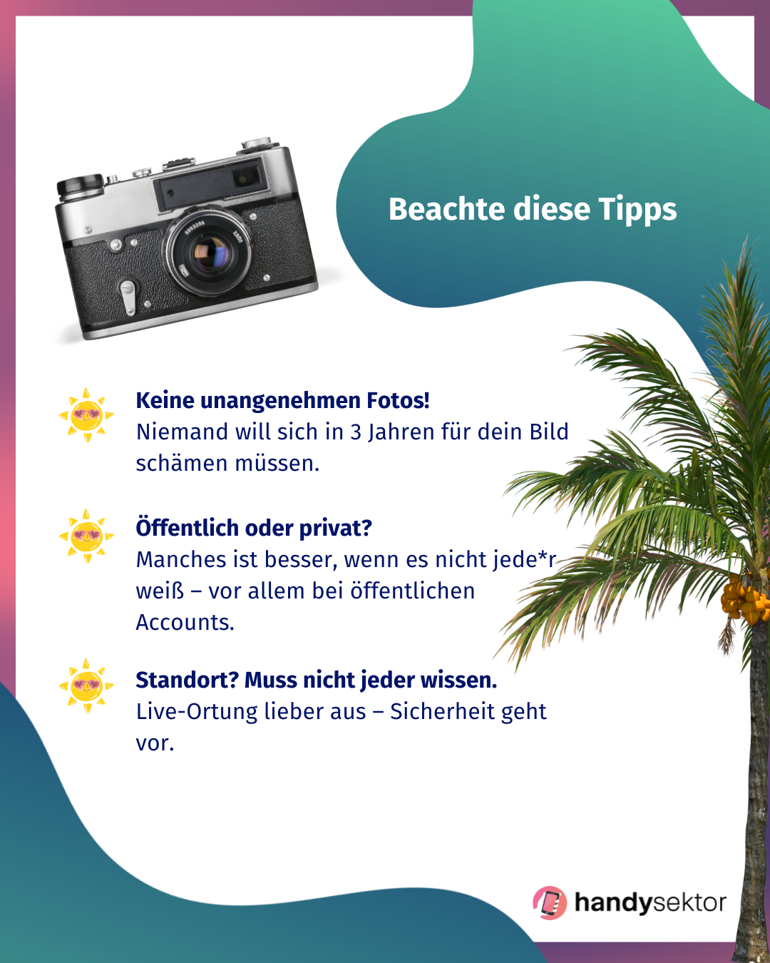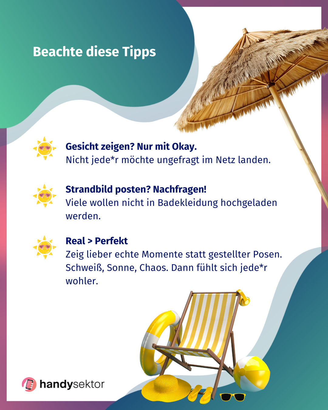 Denk daran, dass nicht jedes Foto online gestellt werden muss. Manche Sommermomente sind nur für dich und deine Freund*innen gedacht – und genau das macht sie besonders. Wenn du aber doch gerne etwas posten willst, dann beachte die Tipps aus diesem Infoposting.