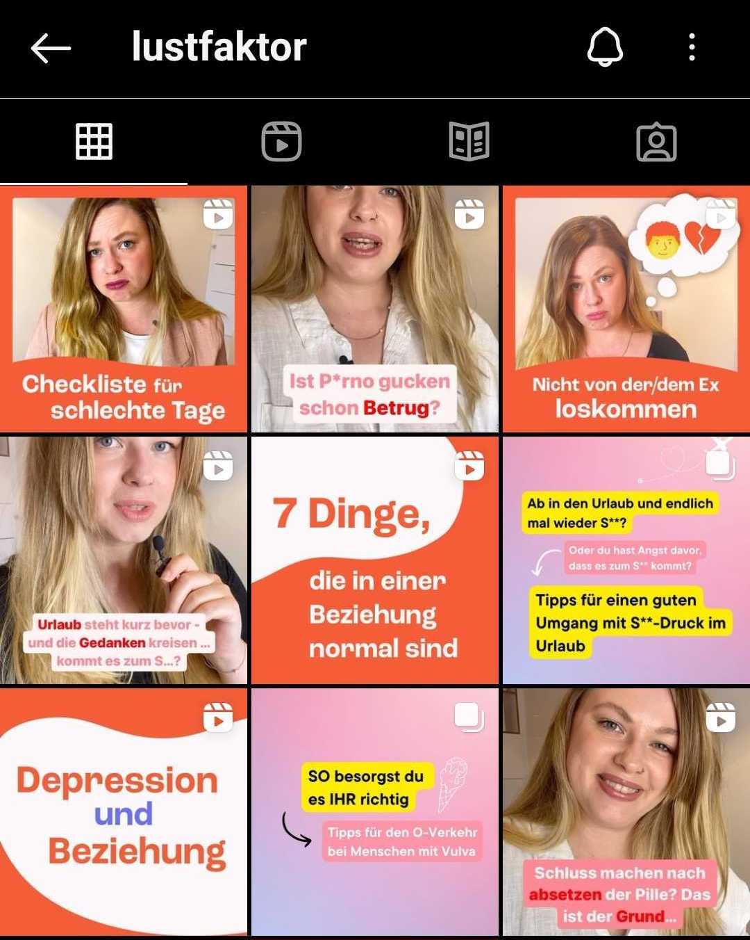 Als letzten Tipp haben wir noch den Instagram Account Lustfaktor für dich. Hinter dem Kanal steckt die Sexual- und Paartherapeutin Julia Henchen. In kurzen Reels und Infoposts spricht sie beispielsweise darüber, was in einer Beziehung "normal" ist, welche Mythen es zum Thema Sex und Partnerschaft gibt und wie du deine Sexualität (mit oder ohne Partner*in) ausleben kannst.