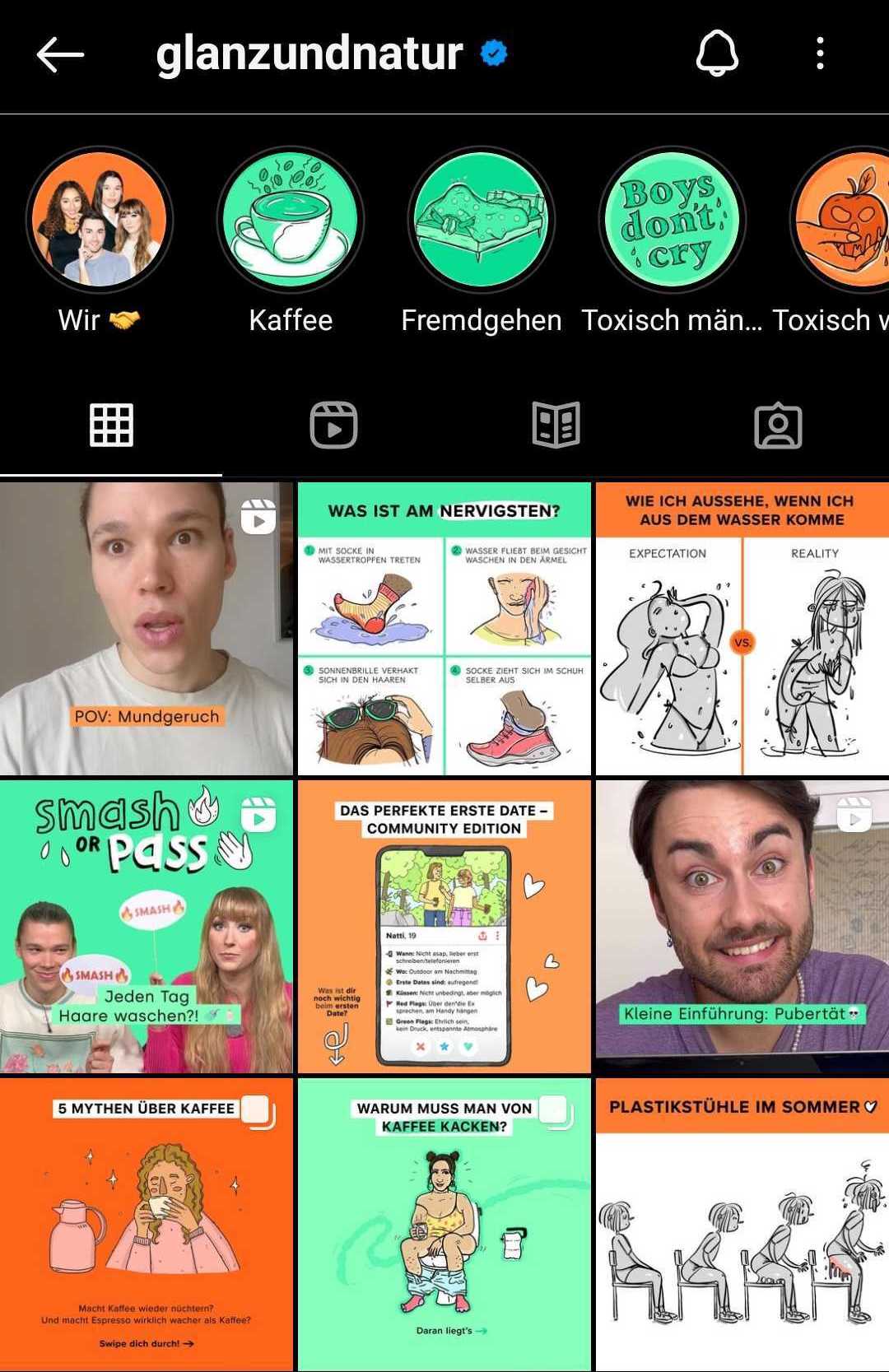 Glanz und Natur ist ein Projekt von funk - dem Jugendprogramm von ARD und ZDF. Auf der Seite findest du Infografiken und kurze (informative oder sehr witzige) Videos zu allen möglichen Themen rund um deinen Körper, Beziehungen und deiner Identität. Dabei ist die Seite erfrischend ehrlich und klärt auch darüber auf, dass in der Realität manches nicht so „perfekt“ ist, wie wir es manchmal in unserer Vorstellung haben. Du willst noch mehr Inhalte? Auch auf der Webseite von funk (und bei TikTok) werden Inhalte von Glanz und Natur hochgeladen.