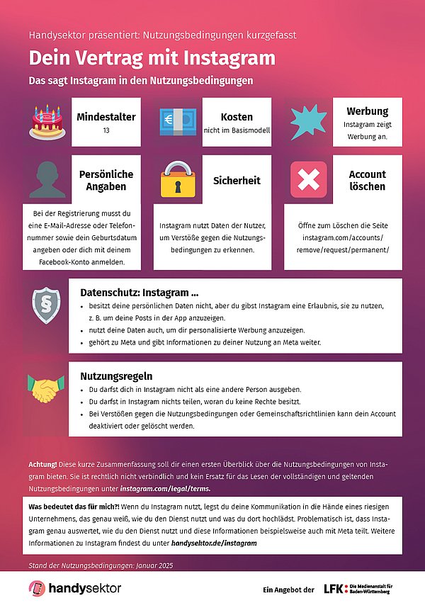 Wir bieten dir "Nutzungsbedingungen kurzgefasst: Dein Vertrag mit Instagram" zum Download an und du kannst es kostenfrei in gedruckter Form bestellen.