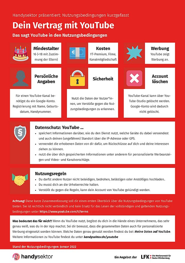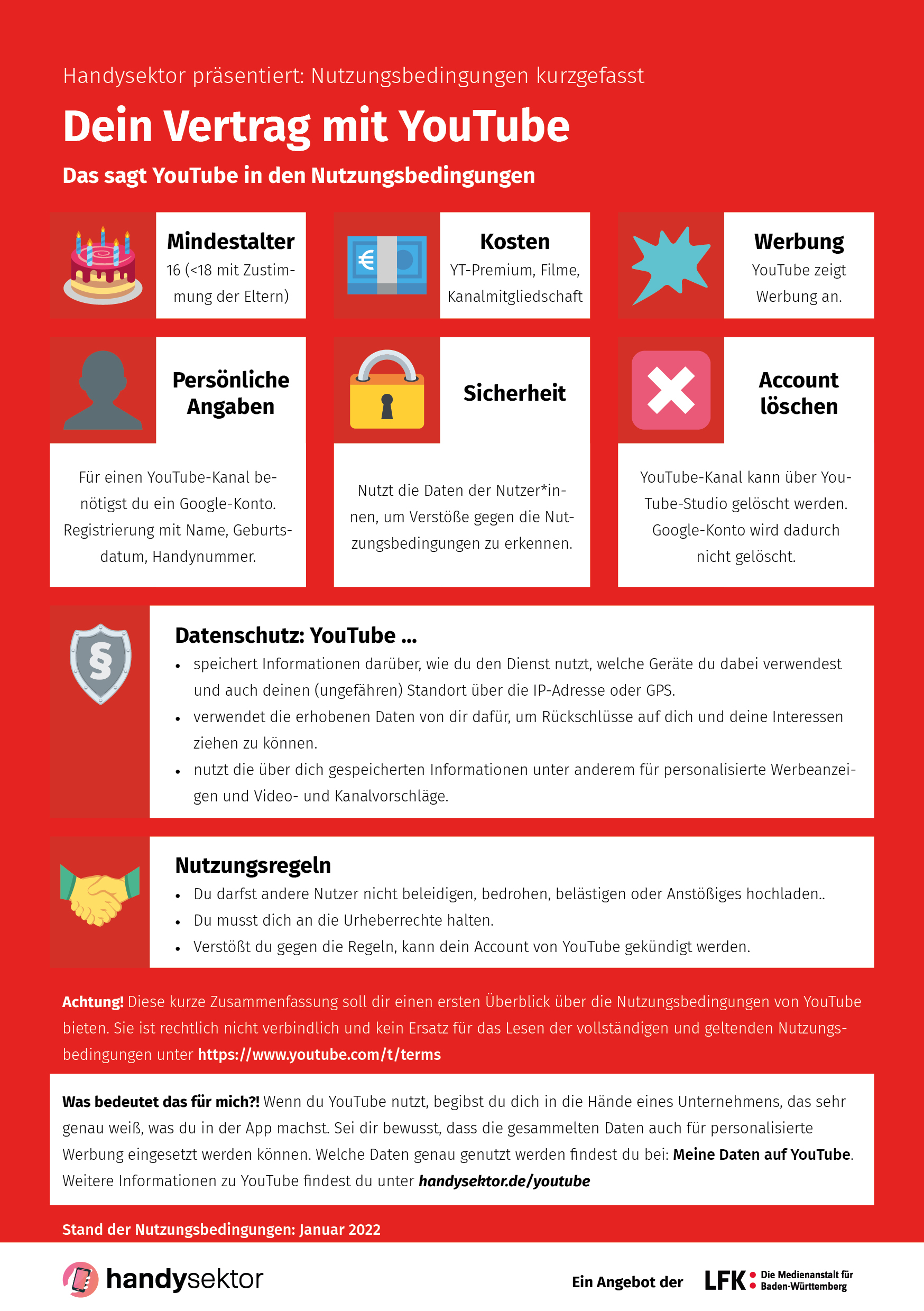 Wir bieten dir "Nutzungsbedingungen kurzgefasst: Dein Vertrag mit YouTube" zum Download an und du kannst es kostenfrei in gedruckter Form bestellen.