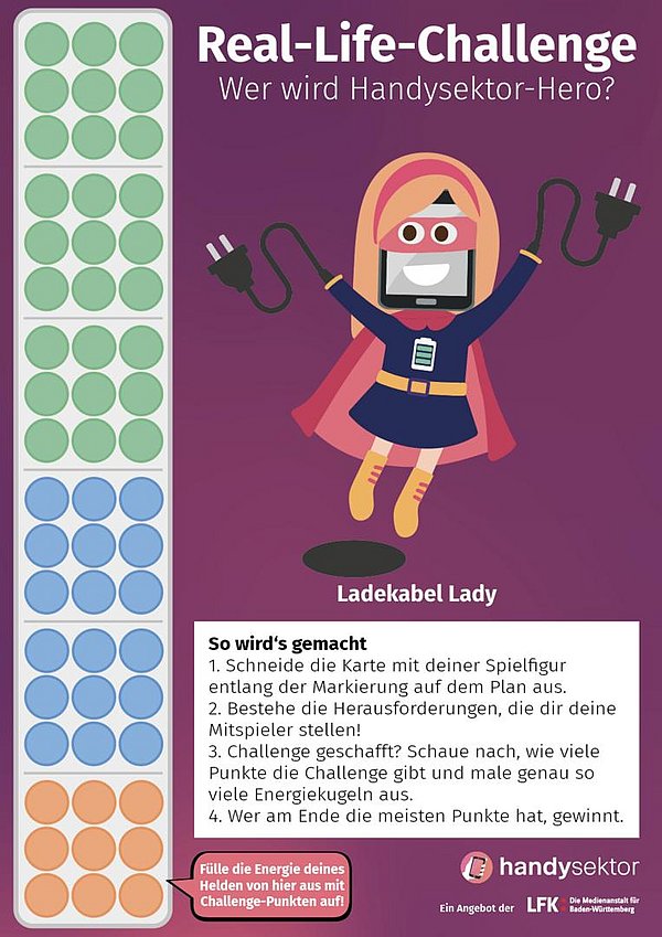 Du willst das Spiel noch spannender machen? Dann nutzt den Spielplan mit den Handysektor-Heroe! Schneidet den Spielplan auseinander und verteilt die Helden auf die Mitspieler. Am Ende jeder Challenge könnte ihr die Punkte für die Challenge als Energiekugeln bei eurem Handysektor-Hero einzeichnen. Wer am Ende die meisten Punkte hat, gewinnt!