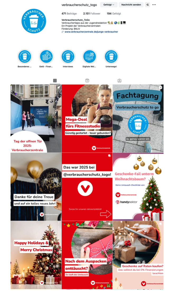 Verbraucherschutz2go ist ein Angebot der Verbraucherzentralen – aber speziell für junge Menschen. Auf Instagram erklärt der Kanal verständlich und alltagsnah, worauf du achten solltest – zum Beispiel bei: