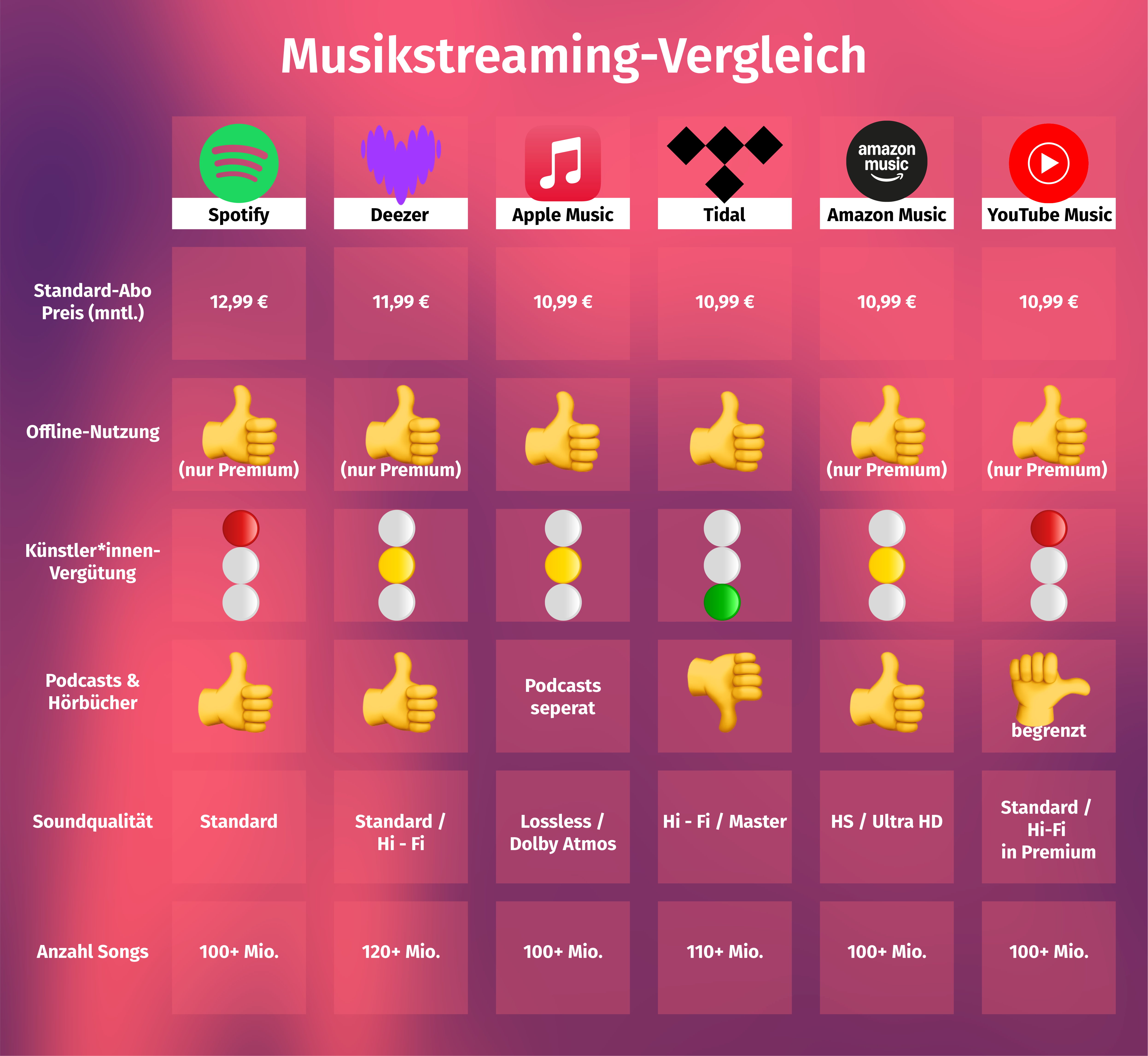 Am Ende hängt die Wahl des Streaming-Dienstes davon ab, was dir am wichtigsten ist. Wenn du viele Podcasts hörst und auf gute Empfehlungen stehst, ist Spotify eine gute Wahl. Für Soundqualität und faire Bezahlung ist Tidal die beste Option. Wenn du Musikvideos liebst, bist du bei YouTube Music richtig. Einen Überblick über alle Vor- und Nachteile bekommst du in dieser Grafik.