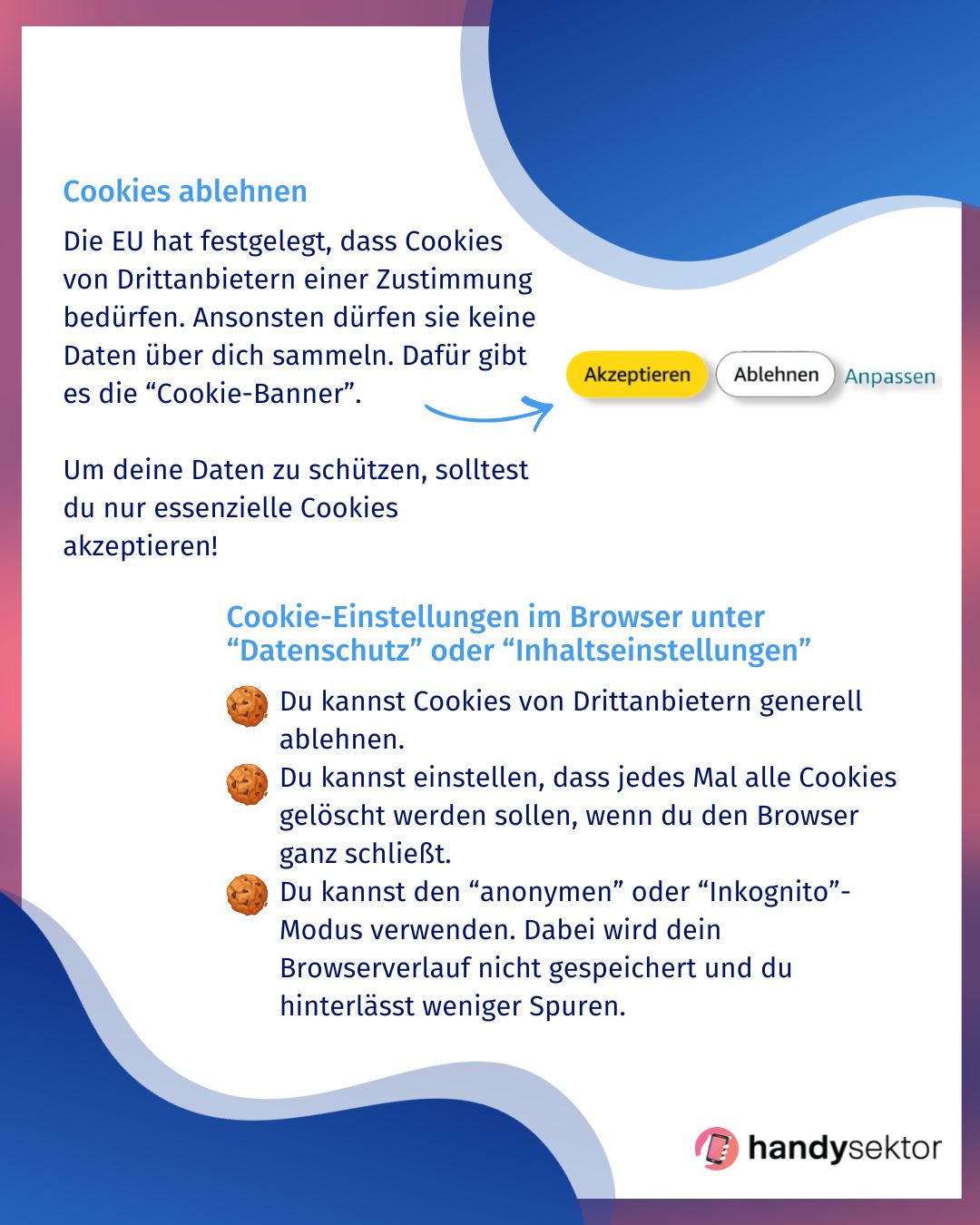 Das kannst du alles in den Einstellungen deines Browsers oder deines Geräts unter „Datenschutz“ oder „Inhaltseinstellungen“ festlegen.